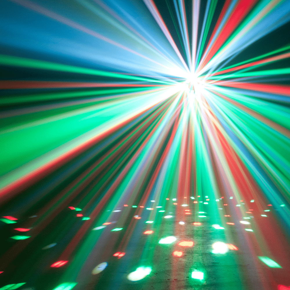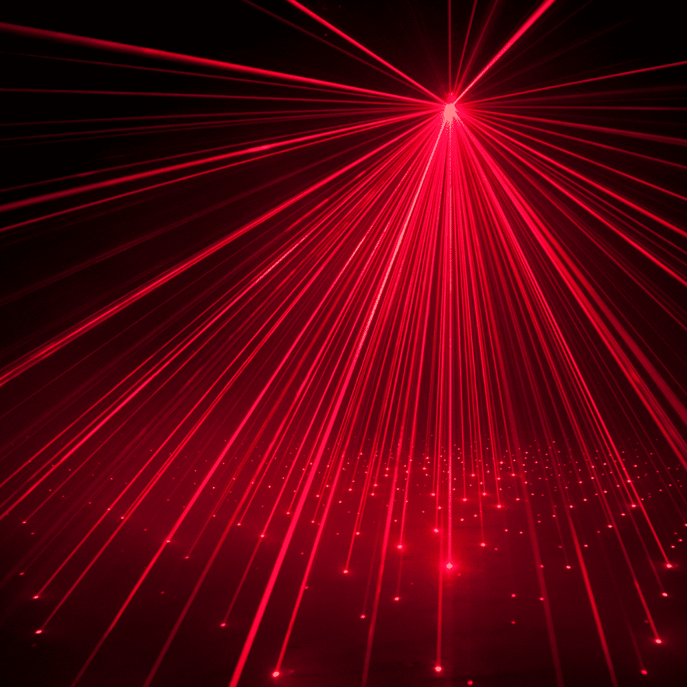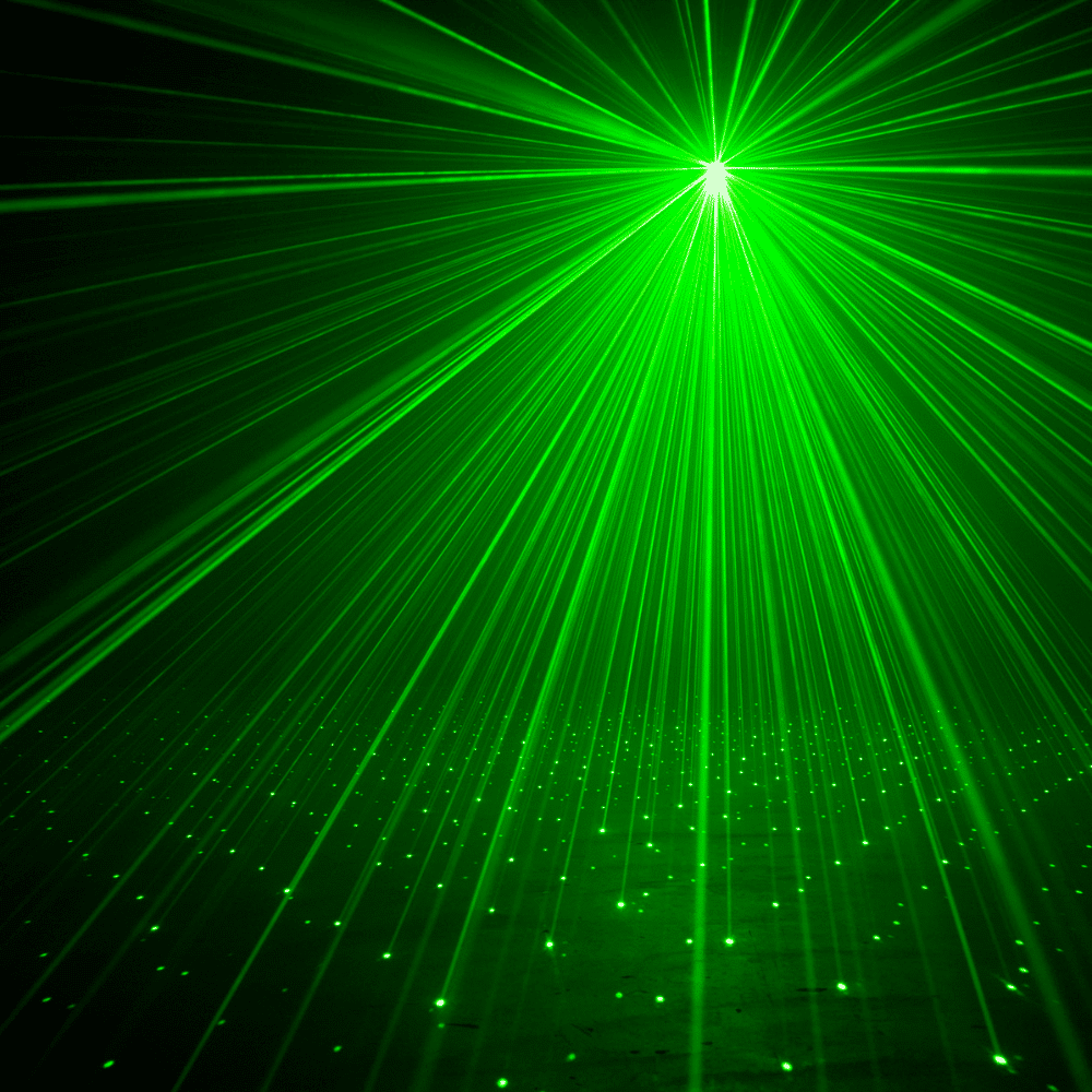 Lézer effekt: Piros és zöld „Galaxian” stílusú lézersugarak töltenek be minden teret éles, szemet gyönyörködtető fénynyalábokkal.